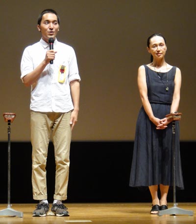 | <舞台挨拶を行なう監督の宍戸とアニマルクラブ石巻の阿部智子さん> |